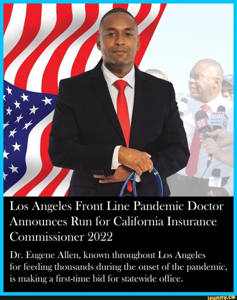 Insurance Commissioner Candidate Dr. Eugene Allen kicks off 2022 with large endorsements from insurance groups, the medical community and city mayors. The Los Angeles doctor has gained support from the California Alliance of Health Care Professionals and Insurance Agents (CAHCP). The organization plans to raise a $5 million-dollar independent expenditure to support Dr. Allen’s run for California Insurance Commissioner.